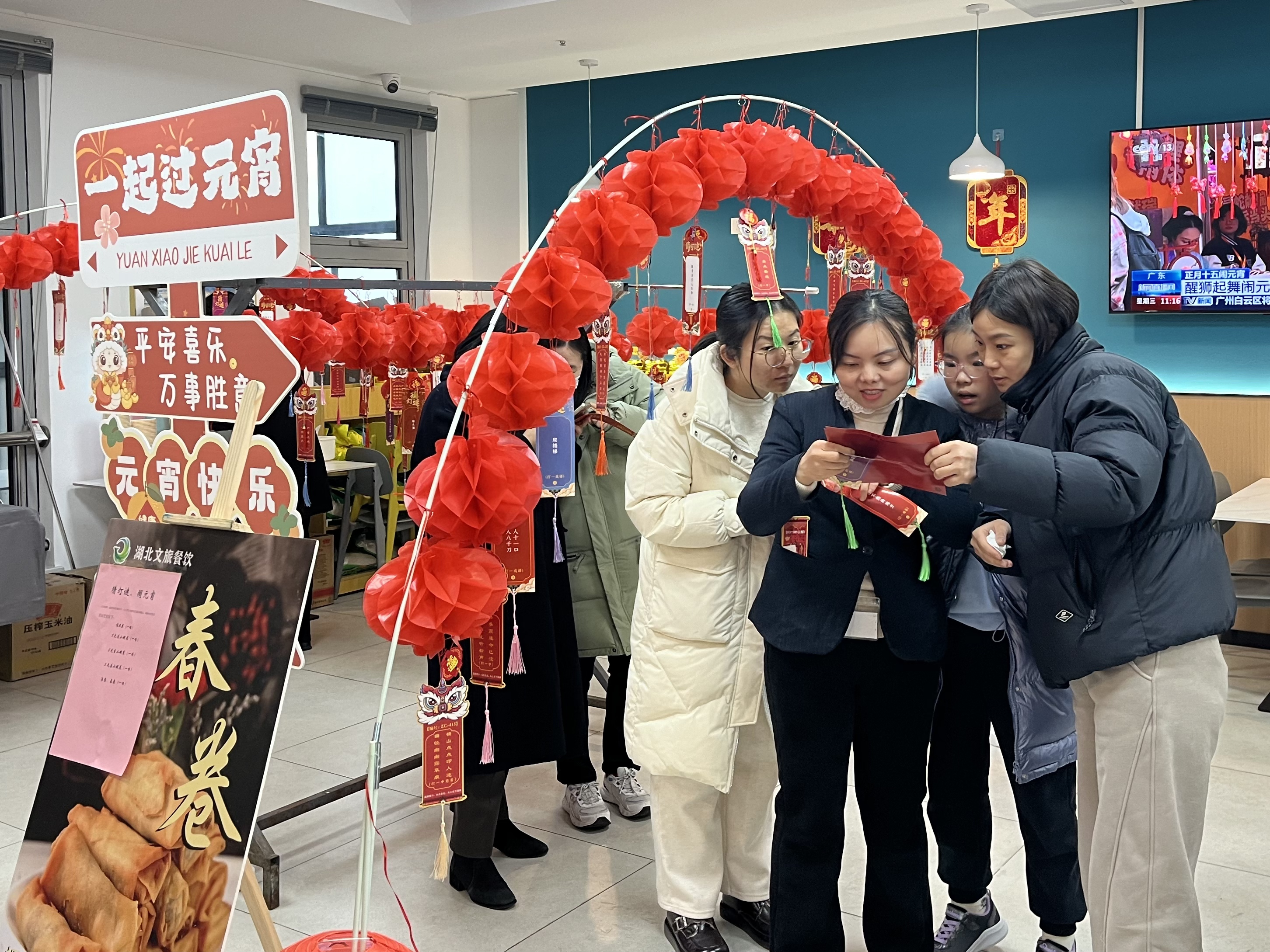 食堂內(nèi)懸掛著各式各樣的燈籠與氛圍裝置,五彩繽紛,節(jié)日氛圍瞬間拉滿。猜燈謎區(qū)域人頭攢動,大家興致勃勃地猜著燈謎,有的凝神思考,有的互相討論,現(xiàn)場歡聲笑語不斷。猜中燈謎的員工還獲得了食堂精心準備的獎品,喜悅之情溢于言表。